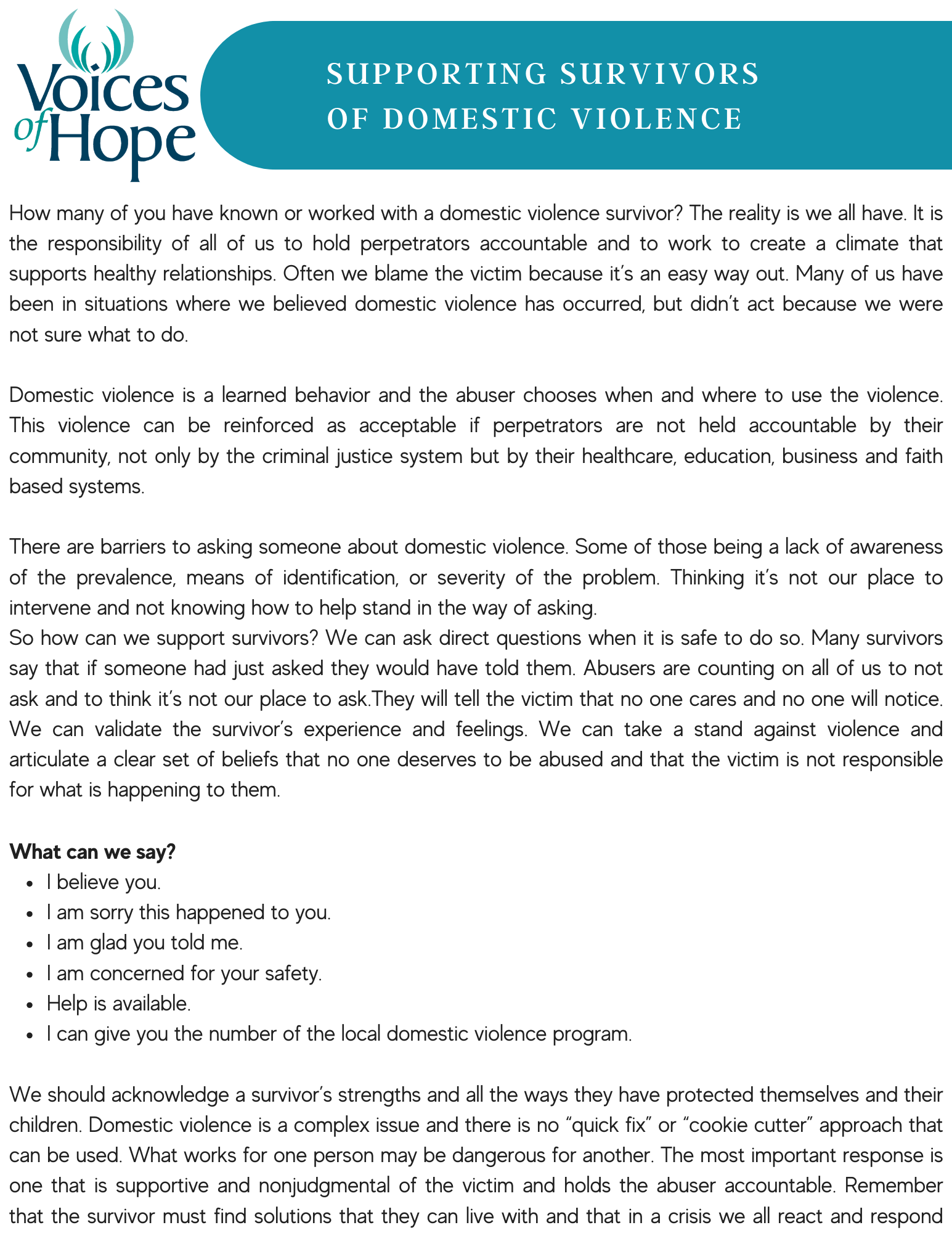 Voices of Hope has provided a variety of resources to help your research or better understand the issues of domestic violence, sexual assault, stalking, harassment, and related forms of abuse. The following provides links to documents, publications, and other websites that may be useful to you as your learn more about these issues.